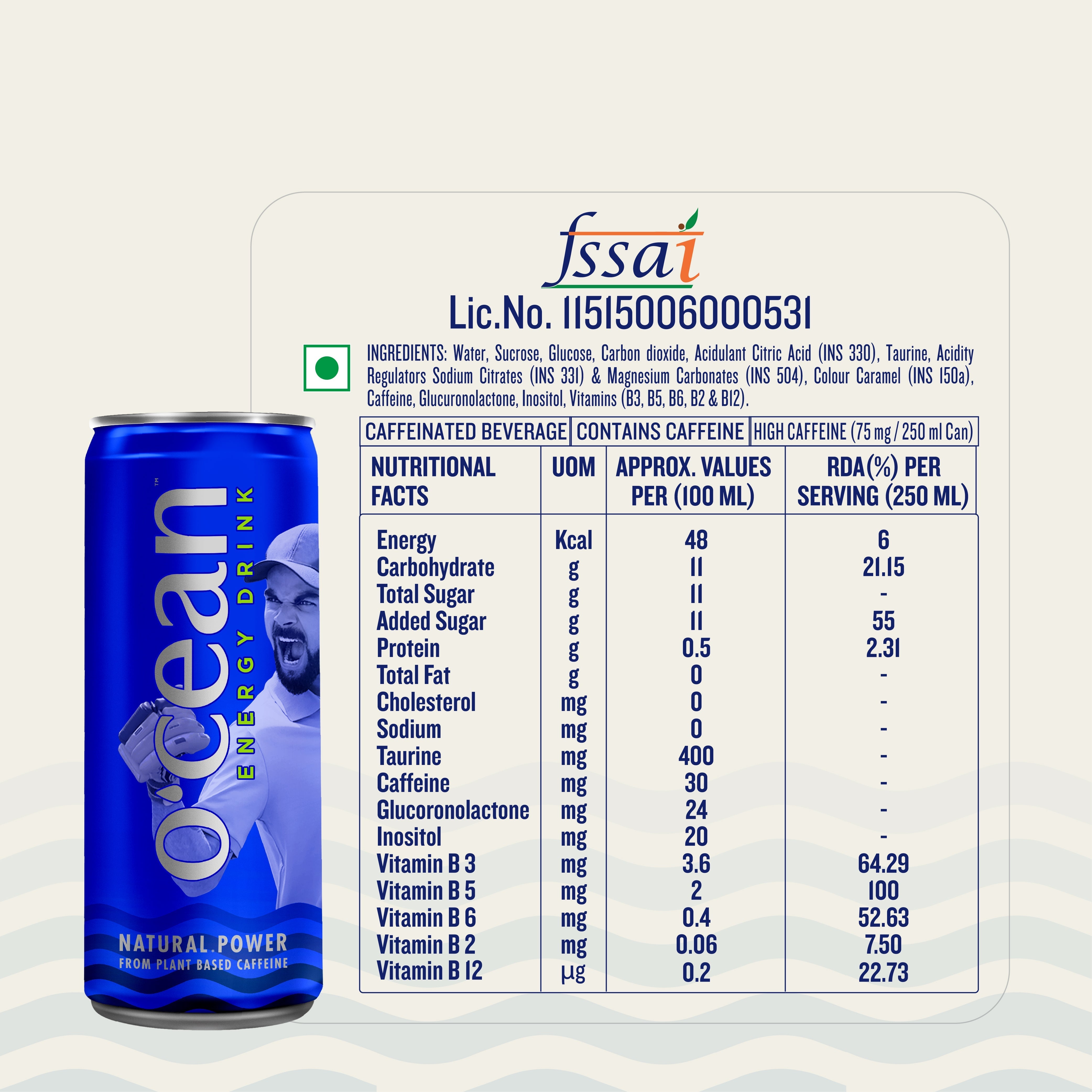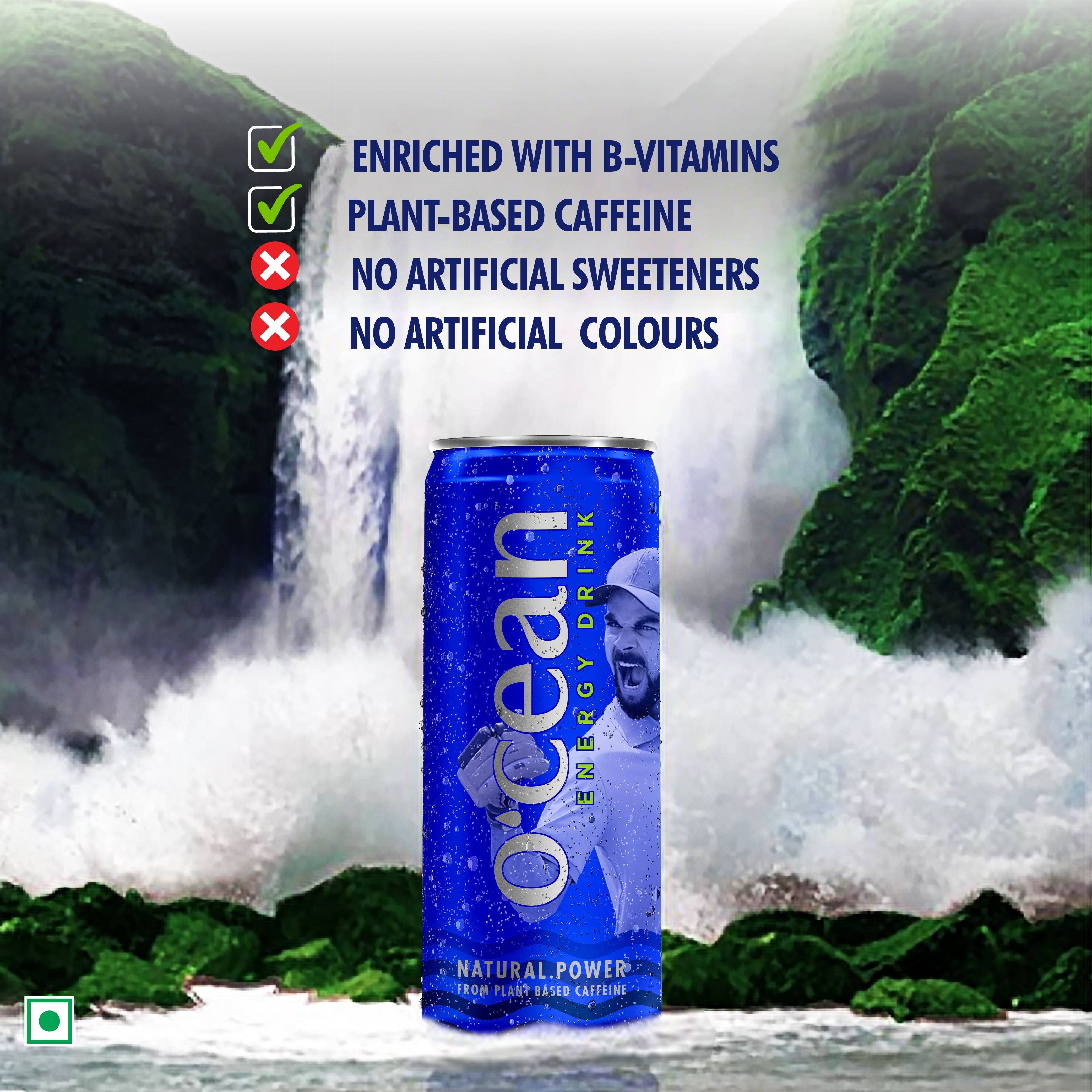 O’cean Energy Drink combines Natural Caffeine, sourced purely from green tea extract, with Glucose & B-Vitamins that help release energy, build your immunity and give you a balanced boost. It also contains Taurine that maintains physical function, increases heart performance & stress regulation. With Natural Power comes natural responsibility.. our cans are made with atleast 70% recycled aluminum.