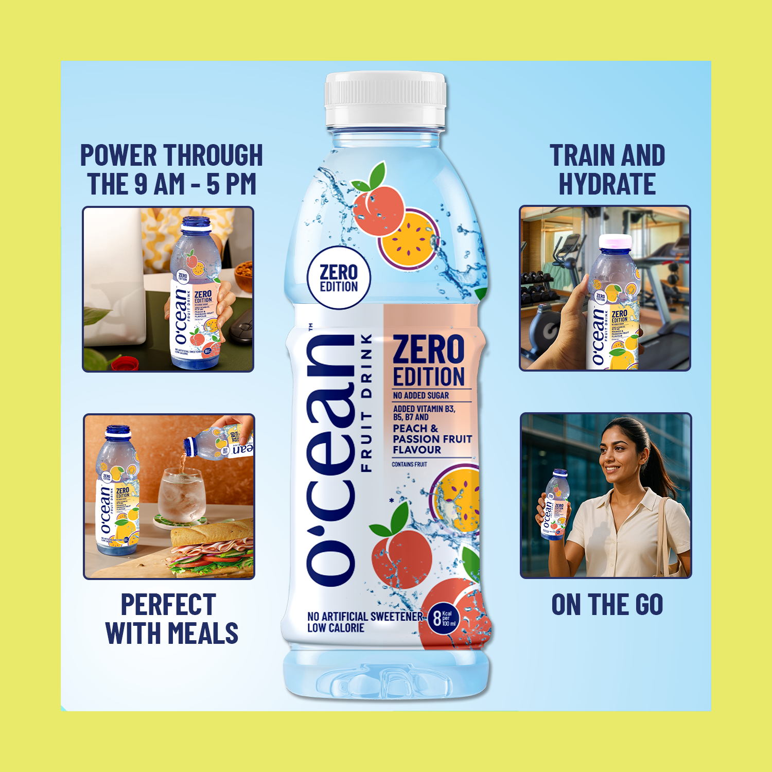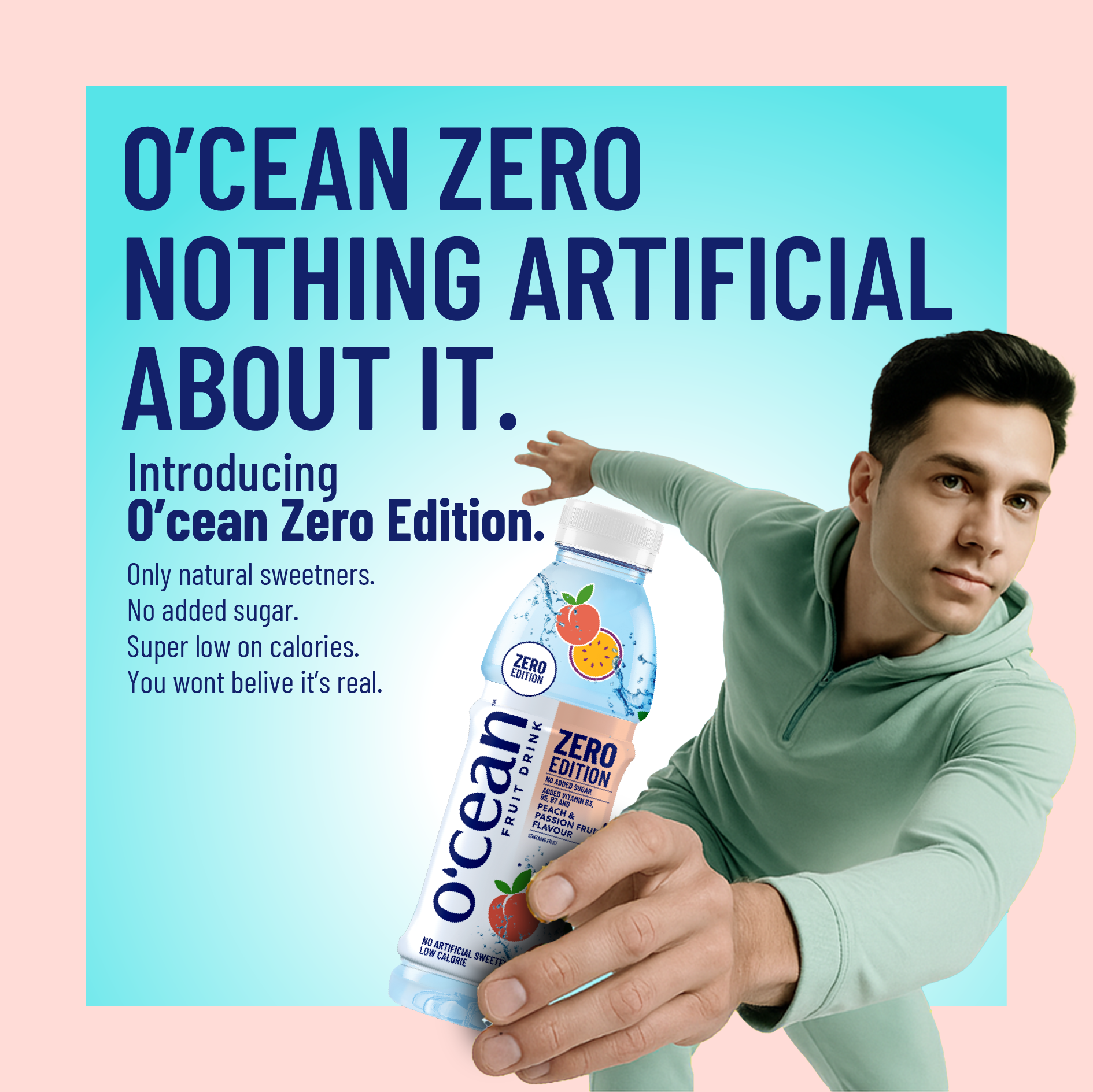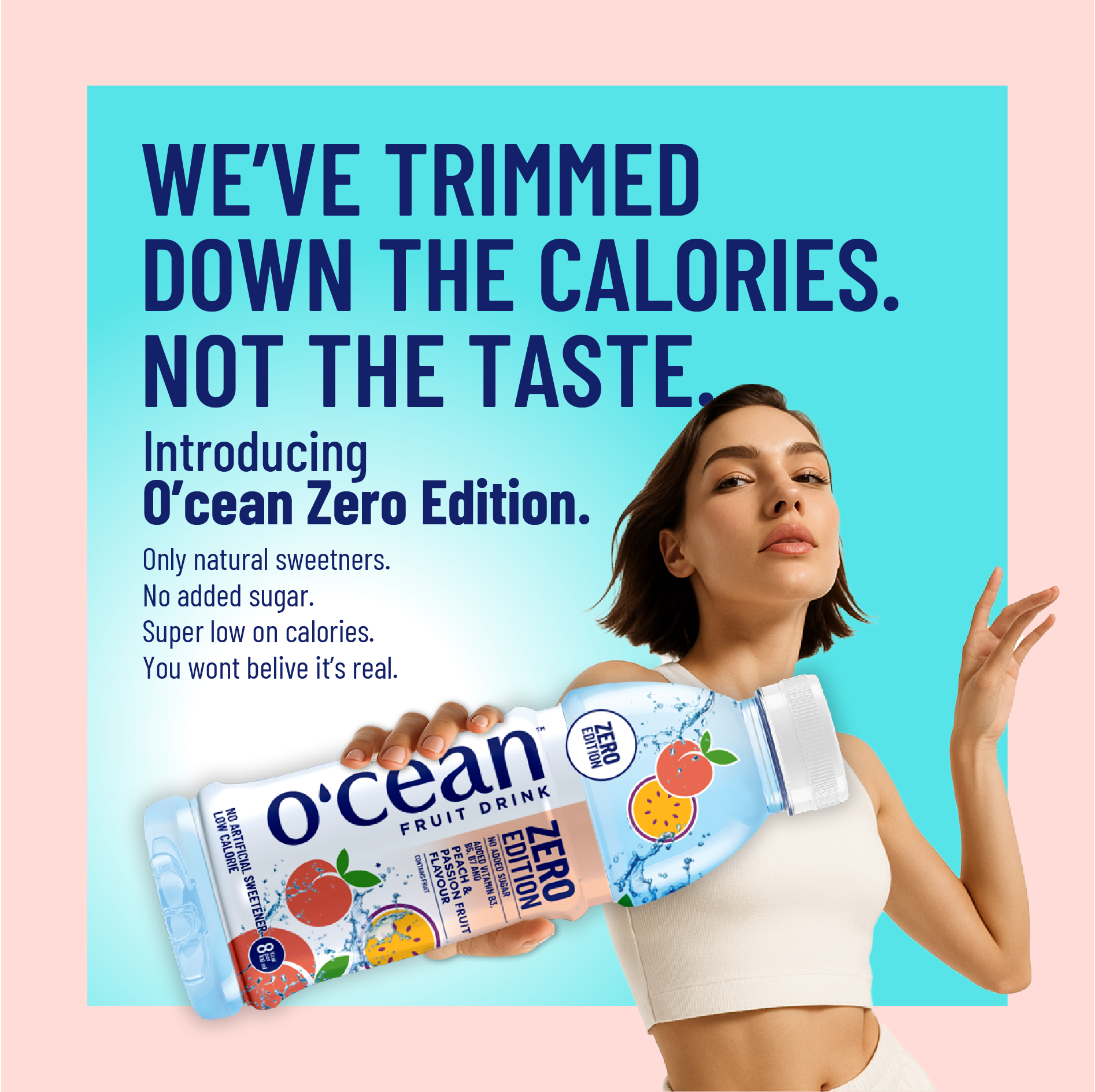 Introducing O’cean Fruit Drink Zero Edition. A crisp, refreshing and delicious Peach and Passionfruit flavoured water with zero added sugar or any artificial sweeteners. It’s loaded with vitamins, electrolytes and minerals and surprisingly low on calories, yet incredibly high on taste
